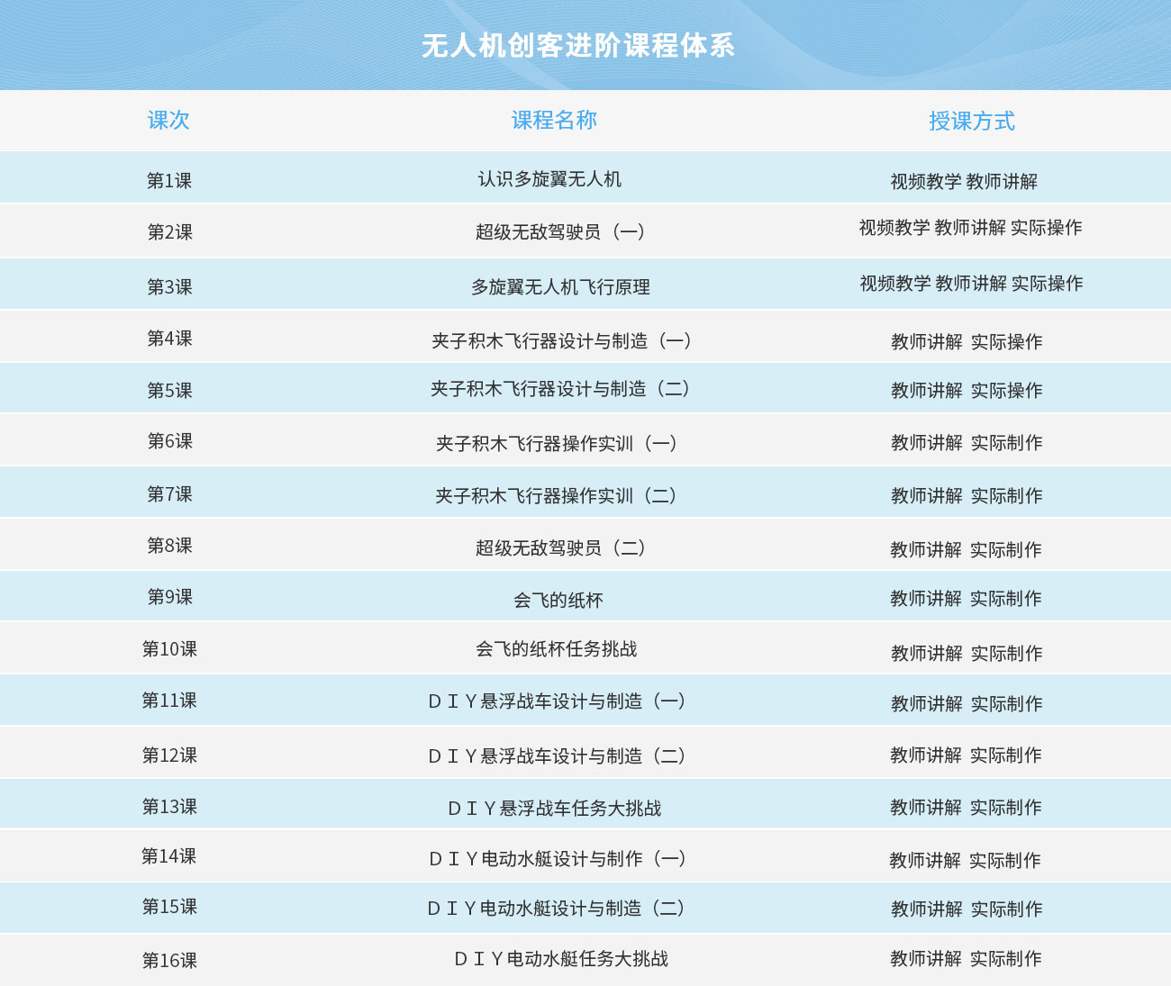 本課程主要授課對象為小學(xué)一至三年級的學(xué)生,課程通過更加深入的學(xué)習(xí)來了解多旋翼無人機的結(jié)構(gòu)組成以及它的飛行操控,以無人機的設(shè)計和創(chuàng)造作為平臺講解,用發(fā)散性思維來拓展更加多元化的DIY設(shè)計創(chuàng)作,親自打造既能上天也能入海的獨特“無人機”