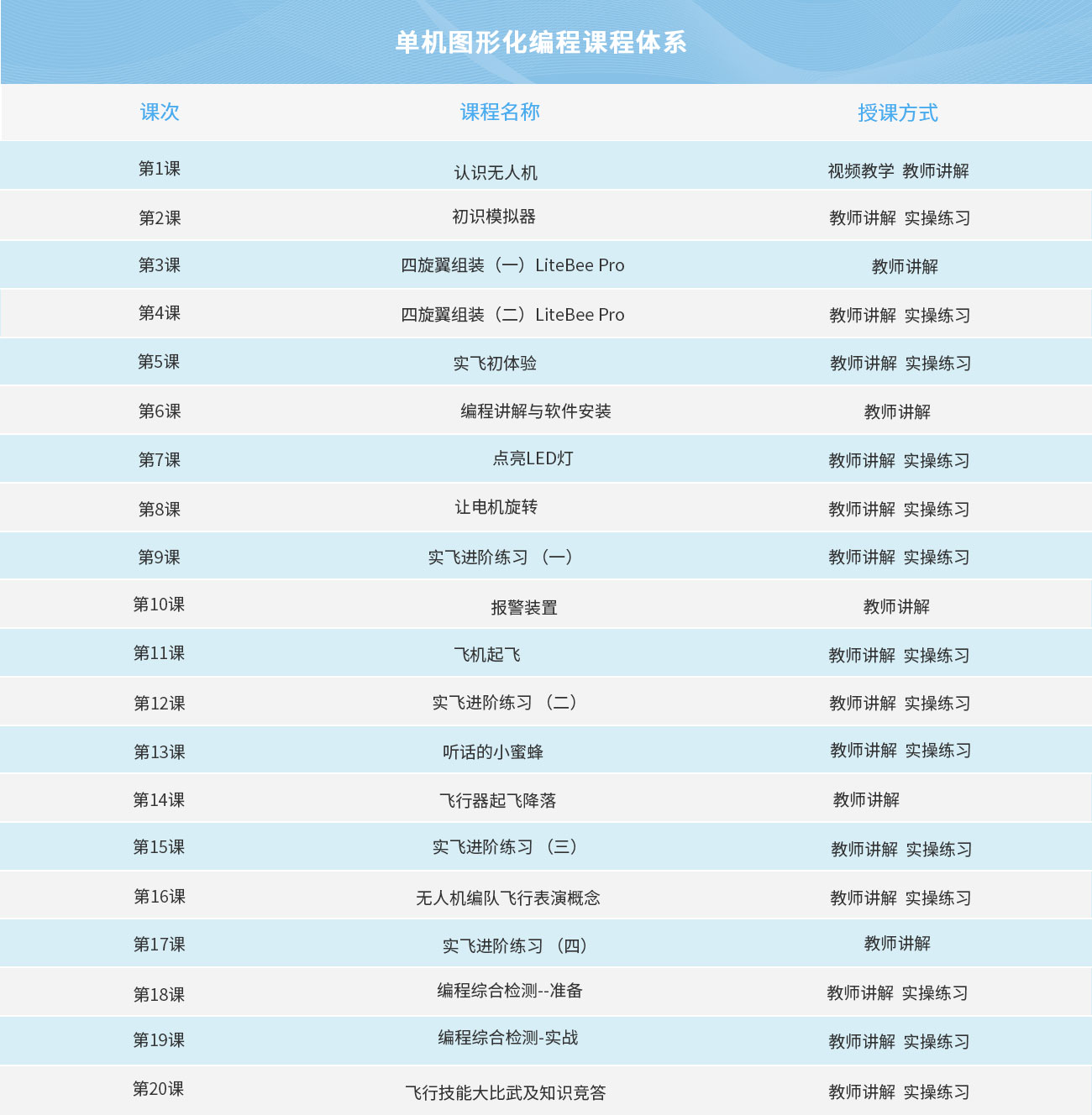 本課程主要授課對象為小學(xué)四年級及以上的學(xué)生,課程主要教導(dǎo)孩子們學(xué)習(xí)無人機(jī)的可編程模塊,了解編程代碼和軟件起到的作用,并通過編程軟件自行設(shè)計(jì)無人機(jī)的飛行動作,并通過編程軟件自行設(shè)計(jì)無人機(jī)的飛行動作,在學(xué)生學(xué)習(xí)以及自主設(shè)計(jì)飛行的過程中,為其打下牢固的編程基礎(chǔ),為以后更深入的學(xué)習(xí)做鋪墊