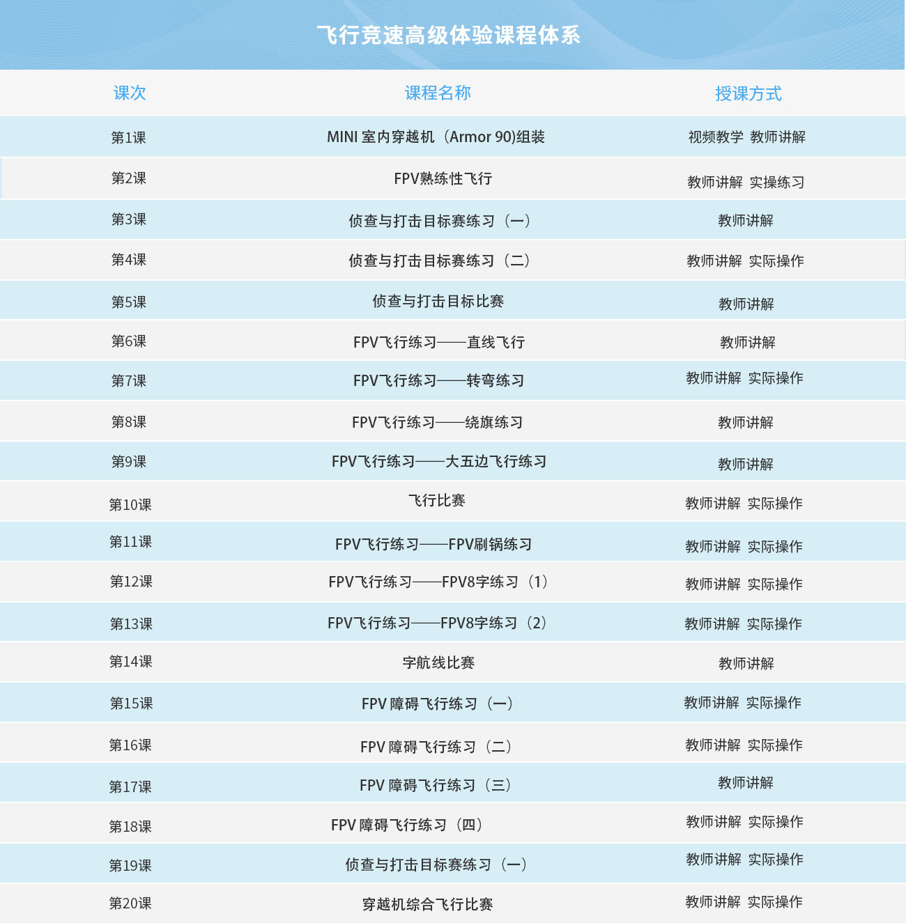 本課程主要深入學(xué)習(xí)穿越機的組成和飛行穿越訓(xùn)練,通過FPV眼鏡和穿越機的結(jié)合,系統(tǒng)練習(xí)FPV飛行技術(shù),并通過實踐賽事提高學(xué)生團隊協(xié)作能力及穿越機操控能力