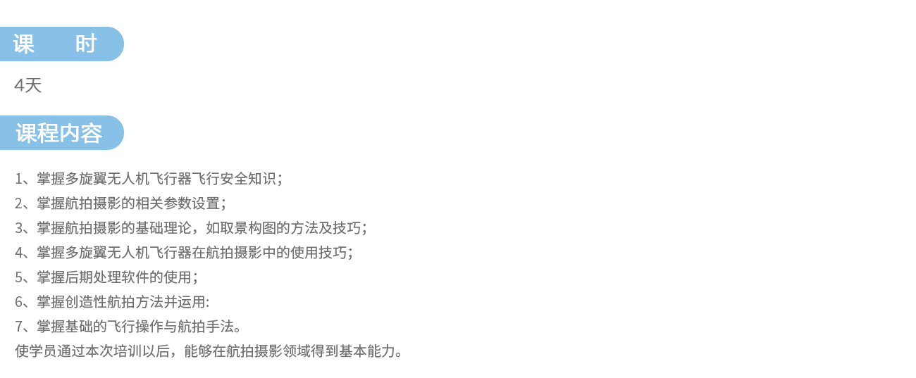 能飛無(wú)人機(jī)學(xué)院航拍特色課程,為航拍愛(ài)好者設(shè)置的專業(yè)課程,該課程中講授了無(wú)人機(jī)航拍在不同行業(yè)領(lǐng)域的應(yīng)用情況、航拍設(shè)備操作、航拍技巧、航拍高度及航線等航拍中需要注意的主要問(wèn)題等內(nèi)容,更有影視后期制作模塊等全系列實(shí)踐技能,力圖使廣大學(xué)員能夠?qū)W到實(shí)用的增值技能,避免攝影器材損失,成為一名合格的航拍飛手。
