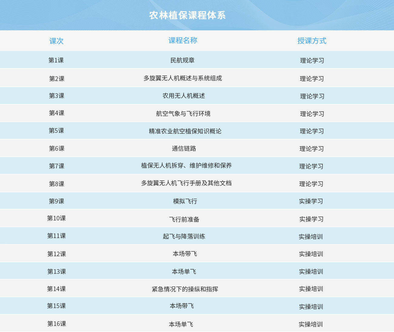 能飛無人機學(xué)院植保特色課程是專為農(nóng)林行業(yè)學(xué)員量身定制的實踐應(yīng)用課程,課程中包含農(nóng)業(yè)專用無人機技術(shù)、原理、噴灑、常見病蟲害等相關(guān)知識,以及噴灑農(nóng)藥的注意事項、法律法規(guī)等等,力求使學(xué)員在取得民航V類植保駕駛員資格的同時,更掌握實際應(yīng)用技能,能夠熟練使用無人機進行農(nóng)業(yè)植保作業(yè)。